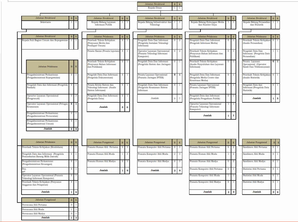 Berdasarkan Peraturan Bupati Belu Nomor 47 Tahun 2021 tentang Kedudukan, Susunan Organisasi, Tugas dan Fungsi, serta Tata Kerja Dinas Komunikasi dan Informatika Kabupaten Belu, struktur organisasi Dinas Komunikasi dan Informatika terdiri atas beberapa unsur pimpinan, pelaksana, dan jabatan fungsional yang memiliki tugas pokok dan fungsi masing-masing. Secara umum, susunan organisasi Dinas Komunikasi dan Informatika Kabupaten Belu adalah sebagai berikut: